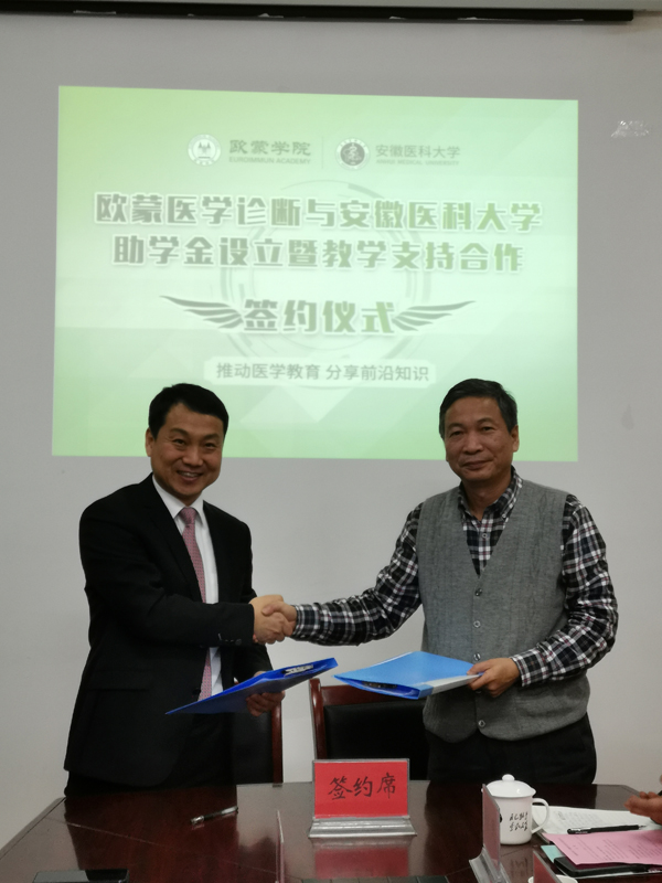 2018年12月19日,歐蒙亞太集團總裁李川先生一行走進安徽醫科大學,筑夢學子,與安徽醫科大學簽署“歐蒙助學金”暨教學支持合作協議。安醫大教育基金會秘書長許柏松,校學生處副處長吳熱生,第一臨床醫學院黨委副書記、學生黨總支書記楊秀蘭,檢驗系主任徐元宏,學生黨總支副書記薛磊等相關負責人出席儀式。