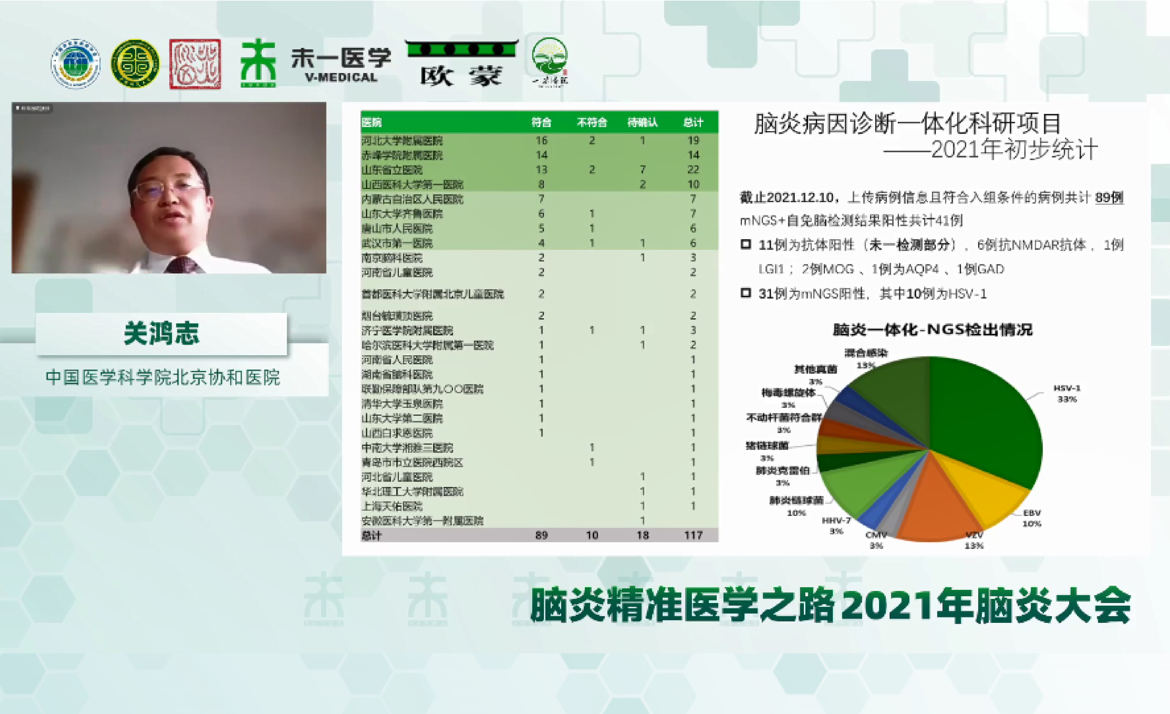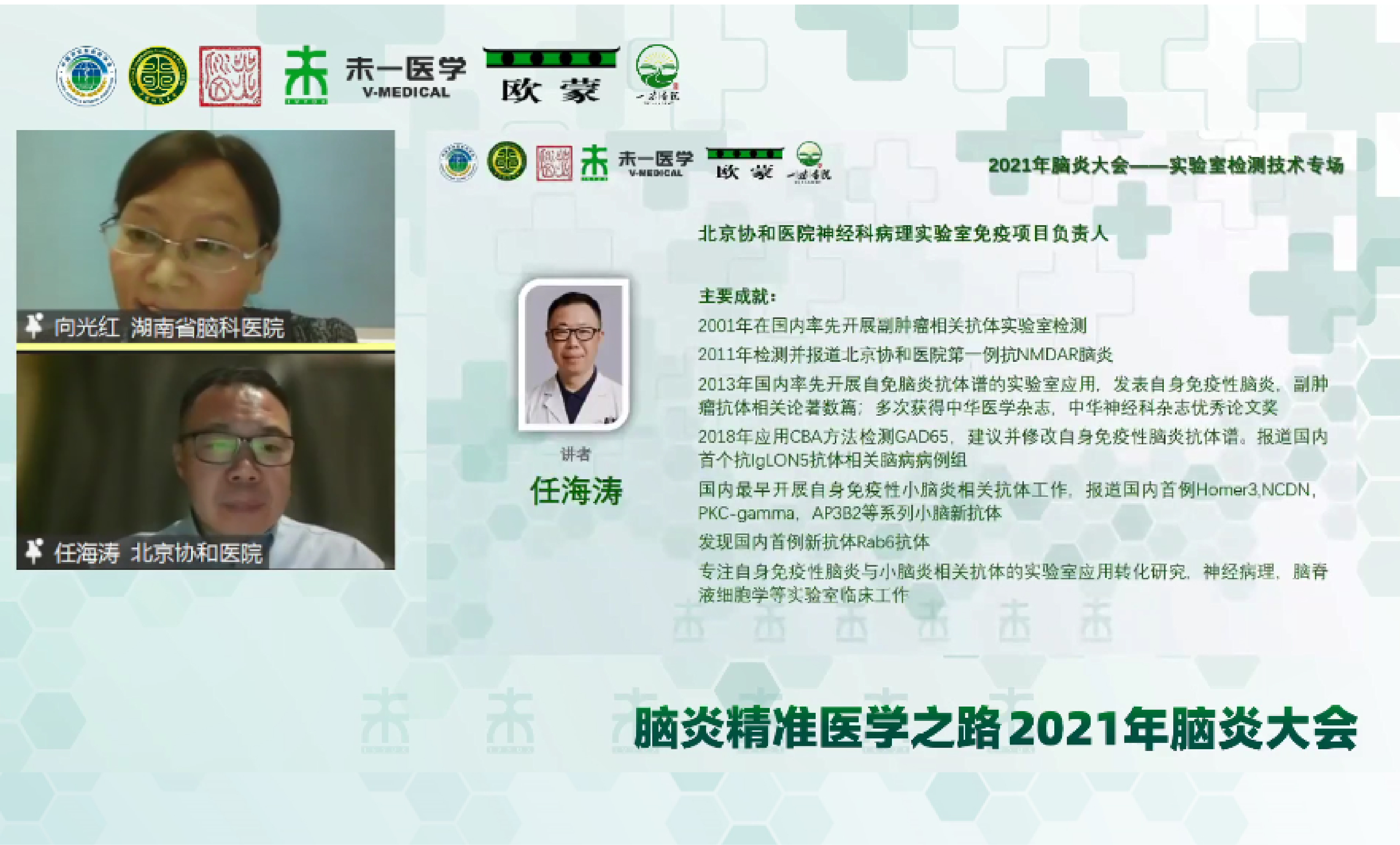 2021年4月23日北京協(xié)和醫(yī)院關鴻志教授團隊與未一醫(yī)學共同發(fā)起了全國多中心腦炎病因診斷一體化方案研究項目,目前已有近30家醫(yī)院參與。未一醫(yī)學作為唯一一家第三方實驗室,為該項目提供樣本檢測以及樣本管理等支持。本次會議上關鴻志教授回顧近半年腦炎病因診斷一體化方案研究進展。對于原因未明的腦炎,通過腦炎一體化項目檢測,協(xié)和醫(yī)院實驗室近兩年發(fā)現(xiàn)了18種抗體,其中與中科院王晶教授團隊,應用TBA方法,發(fā)現(xiàn)了新型抗小腦浦肯野細胞抗體-抗Rab6抗體。對于符合入組標準的患者,項目組可以提供免費的腦脊液細胞學、二代測序宏基因組檢測,同時北京協(xié)和醫(yī)院關教授團隊可提供遠程線上會診。最后,關教授邀請線上的醫(yī)學同仁共同參與到腦炎一體化項目,齊力推動腦炎病因精準診斷前行。未一研究院仲人前教授作為本環(huán)節(jié)的主持嘉賓,結合報告的內容進行精彩總結。