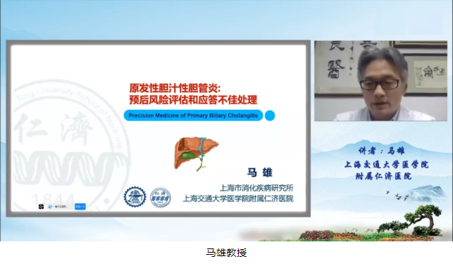 會議首先由我國權威肝臟病學、消化內科專家,上海交通大學醫學院附屬仁濟醫院消化內科主任馬雄教授在線上進行了題為“原發性膽汁性膽管炎:預后風險評估和應答不佳處理”相關的學術報告分享。馬雄教授主要從原發性膽汁性膽管炎疾病(PBC)切入,對PBC患者的臨床診斷、預后風險評估及藥物治療應答不佳處理等方面進行了深入的思考。其間也系統闡述了課題組在PBC相關易感因素、基因分型和腸道菌群等相關致病機制上的最新研究進展。并對抗線粒體抗體AMA陽性的病人在病理學上的一些改變做了詳細的介紹,強調對AMA抗體及肝臟生化指標ALP等陽性但未及時出現亞臨床表現的病人應當更加關注。馬雄教授的報告受到了與會專家的高度評價,將對相關疾病的研究起到了積極的推動作用。