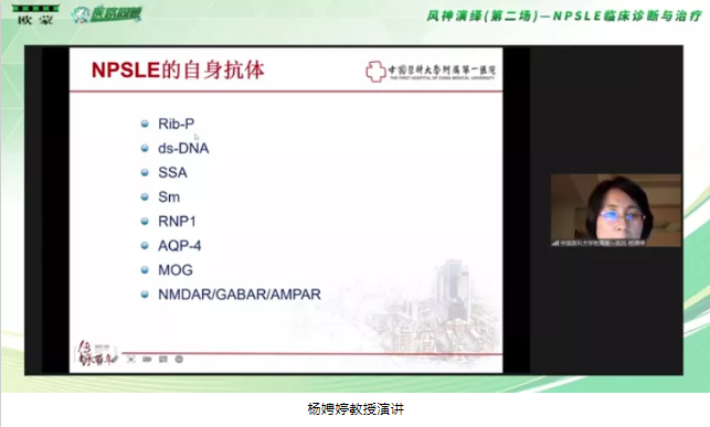 隨后由中國醫科大學附屬第一醫院風濕免疫科主任楊娉婷教授來跟我們分享《如何理解狼瘡腦病》。楊娉婷教授從科研的角度對NPSLE的發病機制進行了詳細解讀,楊教授從四個方面進行了解讀:認為神經炎癥和腦缺血是狼瘡腦病在病理上主要的機制,以及腦屏障通透性的改變,外界的免疫異常就到了腦,可能會導致了狼瘡腦病。另外膠質細胞也是神經炎癥中的關鍵因素。除此之外腦本身存在異常的背景也會使得有些人容易導致狼瘡腦病。并且楊教授認為對于狼瘡腦病我們未來還有很多工作需要做。干擾素的拮抗劑、神經炎癥介質的拮抗劑、以及免疫細胞活化的抑制劑和補體的單抗都是未來的治療靶點。