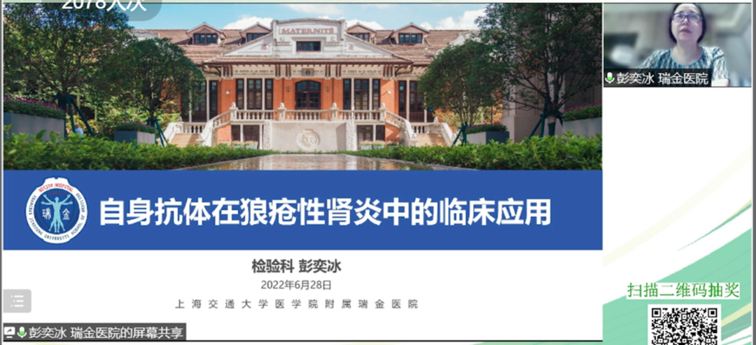 隨后,由彭奕冰教授來跟我們分享《自身抗體在狼瘡腎炎中的臨床應用》。首先,彭教授介紹了SLE是我國最常見的自身免疫性疾病,常累及腎臟,50%的患者伴發狼瘡腎炎,狼瘡腎炎是我國最常見的繼發性免疫性腎小球疾病,更是我國末期腎病的常見病因之一;接著,彭教授介紹了狼瘡腎炎的發病機制,2019狼瘡腎炎診療規范中指出患者應進行血清抗雙鏈DNA抗體、補體、抗磷脂抗體、狼瘡抗凝物檢測,其中抗雙鏈DNA升高和補體下降常與狼瘡腎炎活動性相關;最后,彭教授還分別介紹了抗雙鏈DNA抗體、抗核小體抗體、抗核糖體P蛋白抗體、抗磷脂抗體、抗C1q抗體及抗中性粒細胞胞漿抗體在狼瘡腎炎中的應用,并強調應該多抗體聯合檢測。