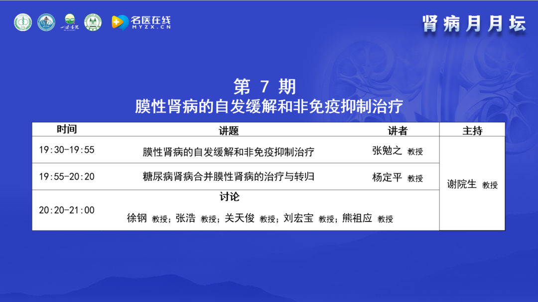 疫情可能影響大家相聚,但卻阻止不了學(xué)術(shù)交流,“腎病月月壇”第七期如期而至。謝教授代表北京中西醫(yī)結(jié)合學(xué)會腎臟病專業(yè)委員會對各位專家、各位同仁及各位朋友出席本期“腎病月月壇”表示熱烈的歡迎和衷心的感謝。謝教授介紹,“腎病月月壇”簡單五個(gè)字卻蘊(yùn)含著三層寓意:首先,“腎病”是指咱們論壇聚焦腎病和腎臟相關(guān)疾病的診斷、治療和預(yù)防,臨床、科研和教學(xué)。因?yàn)楝F(xiàn)在腎臟病很常見,腎臟病的診療手段日升月異。比如膜性腎病,血中抗體的無創(chuàng)診斷,單克隆抗體的合理使用等,不學(xué)習(xí)就會落伍。其次,是“月月”,本論壇每個(gè)月舉辦一次,時(shí)間固定在每個(gè)月第三周的星期二晚上19:30-21:30,以便于參會者能夠提前安排好時(shí)間準(zhǔn)時(shí)參加線上直播,同時(shí),為了滿足時(shí)間確實(shí)沖突無法參加線上直播又迫切想學(xué)習(xí)的同行而提供了回放功能;最后是“壇”,“壇”也有三層意思,一是學(xué)術(shù)論壇,在這里只要是學(xué)術(shù)相關(guān)的內(nèi)容,什么都可以說。二是談話、交談,大家可以在這里平等地交談。三是平臺,學(xué)術(shù)交流的平臺、思想交流的平臺,情感交流的平臺,我們很多老朋友很久沒有見面了,通過腎病月月壇,可以每個(gè)月在云端見面一次。謝教授介紹道,“腎病月月壇”自今年5月17日開壇以來,每期一個(gè)主題,已經(jīng)舉辦了六期,包括“激素和免疫抑制劑在膜性腎病的合理應(yīng)用”、“利妥昔單抗在膜性腎病的合理應(yīng)用”、“原發(fā)性和繼發(fā)性膜性腎病的鑒別”及“中醫(yī)對膜性腎病的認(rèn)識”、“膜性腎病的抗原分類及發(fā)病機(jī)制”以及“膜性腎病的臨床表現(xiàn)、無創(chuàng)診斷和病理診斷”。本期論壇的主題是“膜性腎病的自發(fā)緩解和非免疫抑制治療”。邀請的講者和點(diǎn)評、討論嘉賓都是業(yè)內(nèi)非常著名的臨床專家、研究生導(dǎo)師、業(yè)務(wù)院長、大內(nèi)科主任、腎內(nèi)科主任,具有豐富的臨床、教學(xué)和科研經(jīng)驗(yàn),相信他們的分享一定會對大家的臨床診療有所幫助。