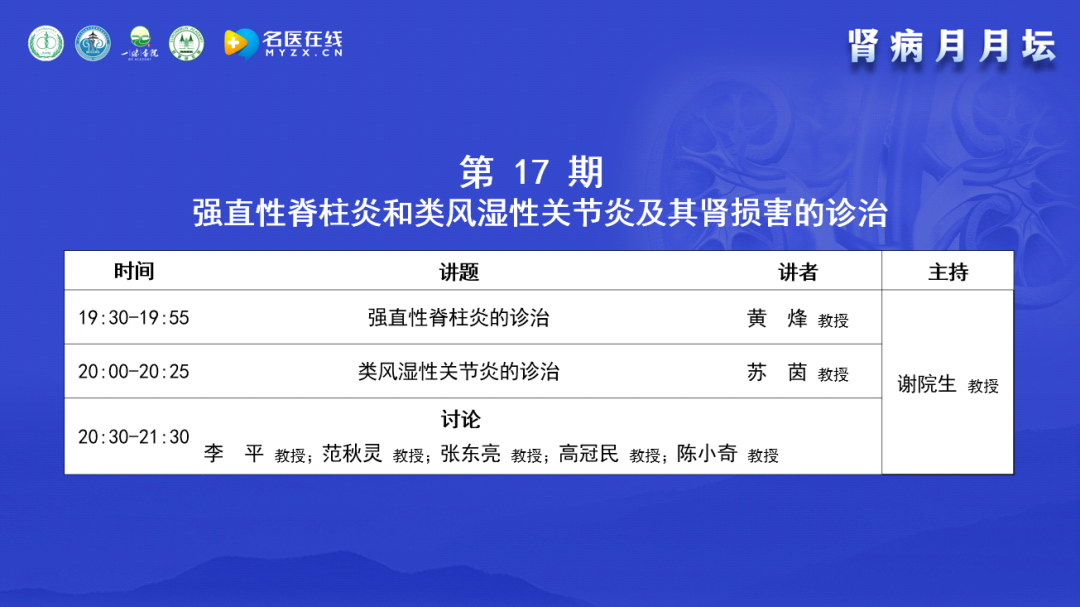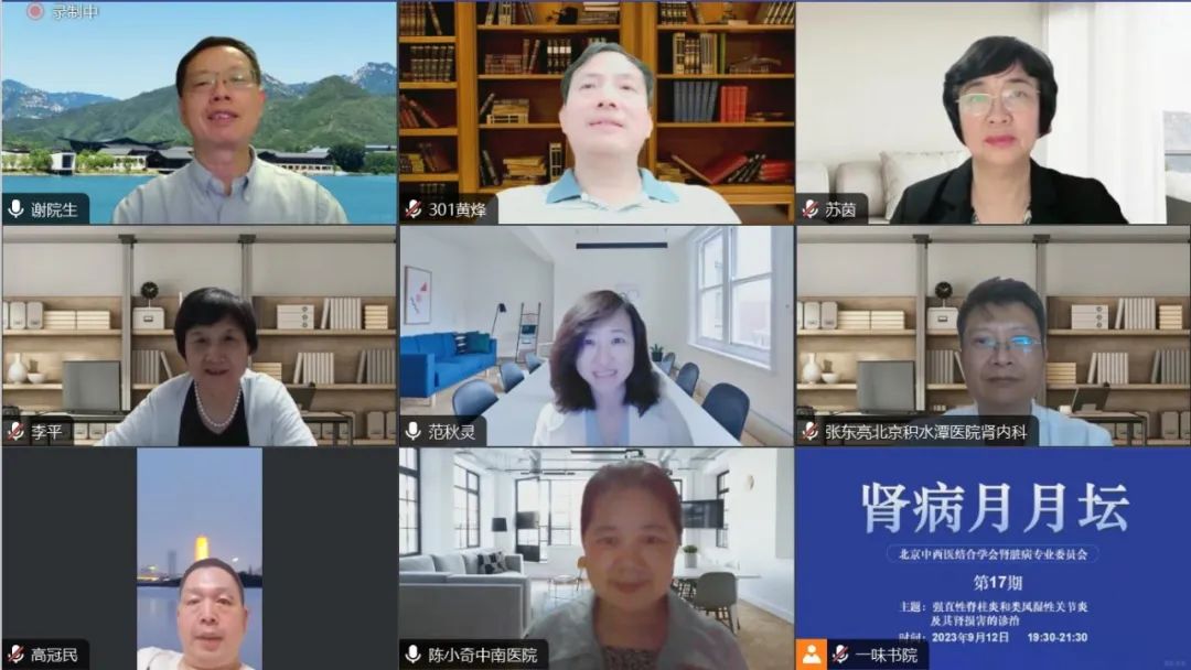 2023年9月12日,由北京中西醫(yī)結合學會腎臟病專業(yè)委員會舉辦的《腎病月月壇(第17期)——強直性脊柱炎和類風濕性關節(jié)炎及其腎損害的診治》于線上成功舉行。本次論壇由北京中西醫(yī)結合學會腎臟病專業(yè)委員會主任委員、解放軍總醫(yī)院謝院生教授擔任大會主席,解放軍總醫(yī)院第一醫(yī)學中心黃烽教授、北京大學人民醫(yī)院蘇茵教授作為講課嘉賓,中日友好醫(yī)院李平教授、上海交通大學醫(yī)學院附屬第一人民醫(yī)院范秋靈教授、首都醫(yī)科大學附屬北京積水潭醫(yī)院張東亮教授、鄭州大學第一附屬醫(yī)院高冠民教授以及武漢大學中南醫(yī)院陳小奇教授作為本次大會的討論嘉賓。