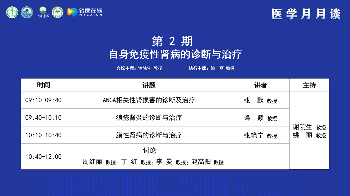 謝教授簡(jiǎn)單介紹了“醫(yī)學(xué)月月談”的前身“腎病月月壇”的歷史,“腎病月月壇”是在疫情防控期間開展的線上學(xué)術(shù)交流活動(dòng),以腎臟病或系統(tǒng)性疾病腎損害的診治為主,每期一個(gè)主題,為了讓更多的人受益,升級(jí)為“醫(yī)學(xué)月月談”。“醫(yī)學(xué)月月談”以臨床需求為導(dǎo)向,以解決臨床問(wèn)題為目的,具有以下特色和優(yōu)勢(shì):①每月1-2次,一般在星期六上午;②線下和線上相結(jié)合,線下在全國(guó)主要城市輪流舉辦,線上直播,會(huì)后回放;③每期一個(gè)主題,設(shè)立專題執(zhí)行主席,與會(huì)議主席一起主持“醫(yī)學(xué)月月談”;④講座、病例分享與點(diǎn)評(píng)討論相結(jié)合;⑤多學(xué)科交叉融合,涉及腎內(nèi)科、風(fēng)濕免疫科、神經(jīng)內(nèi)科、檢驗(yàn)科、皮膚科、呼吸科、腫瘤科等多學(xué)科的學(xué)術(shù)交流;⑥突出西醫(yī)和中醫(yī)相結(jié)合、臨床和檢驗(yàn)/病理相結(jié)合、精準(zhǔn)診斷和有效治療相結(jié)合,為醫(yī)患提供更全面的學(xué)術(shù)支持。