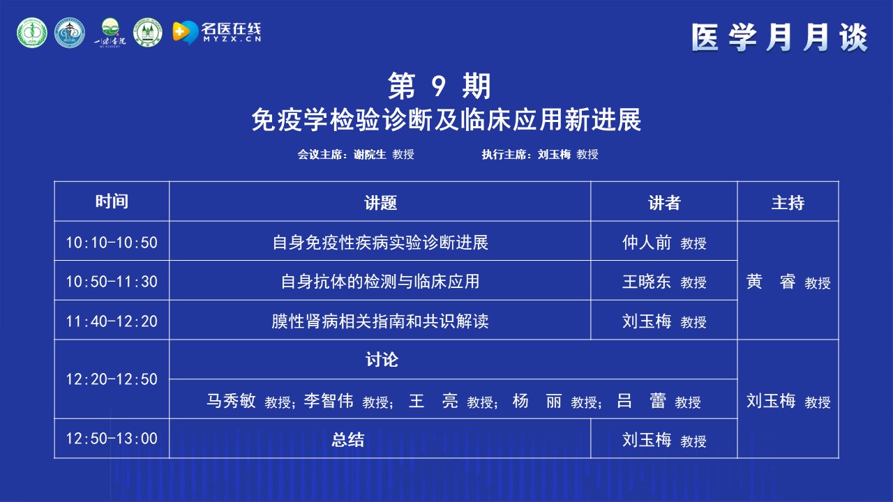 謝教授簡單介紹了“醫學月月談”的前身“腎病月月壇”的歷史,“腎病月月壇”是在疫情防控期間開展的線上學術交流活動,以腎臟病或系統性疾病腎損害的診治為主,每期一個主題,形式和內容都很受歡迎。為了讓更多的人受益,升級為“醫學月月談”。“醫學月月談”秉承“腎病月月壇”的優良傳統,聚焦醫學工作的熱點和難點,以臨床需求為導向,以解決臨床問題為目的,每月主辦1-2次線下和線上相結合的醫學交流活動,線下在全國的城市輪流舉辦,已相繼在北京、沈陽、上海、南京、武漢、福州等地成功舉辦8期醫學月月談。本期醫學月月談的主題是免疫學檢驗診斷及臨床應用新進展,非常榮幸的邀請到新疆維吾爾自治區中醫醫院檢驗科主任劉玉梅教授作為本期的執行主席,相信本期月月談將在劉教授的引導下,在各位專家們的大力支持下,取得圓滿成功。